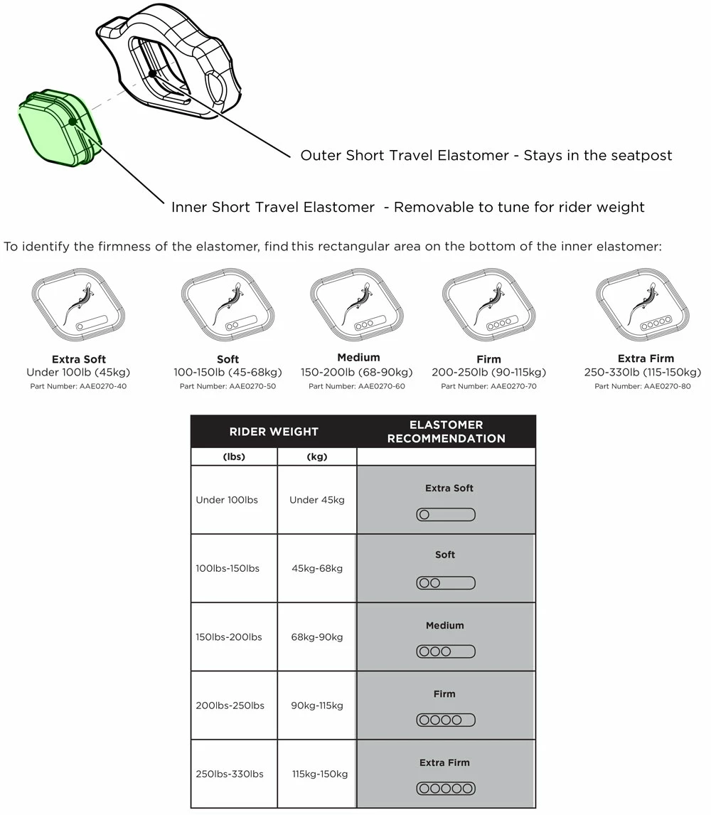 Avec les élastomères de Cane Creek, tu peux adapter ta tige de selle Thudbuster G4 ST au poids spécifique du cycliste et au confort souhaité en un tour de main grâce aux différents degrés de dureté.