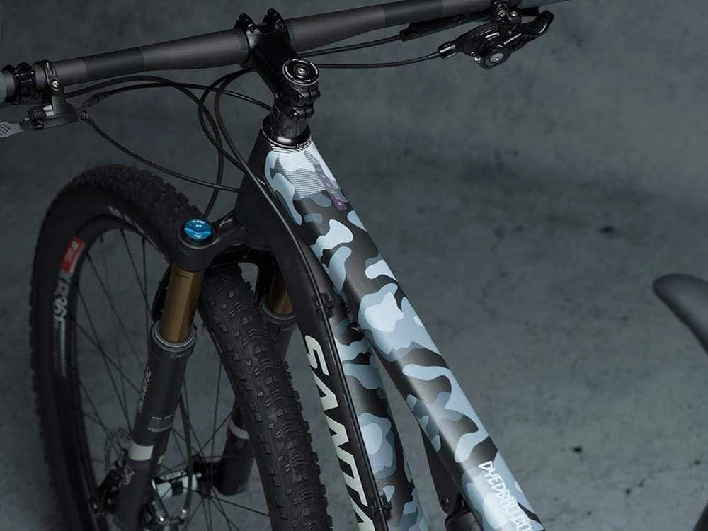 Protection de cadre avec un motif de camouflage imprimé. La protection est transparente, vous pourrez donc toujours voir la couleur de votre vélo en dessous.