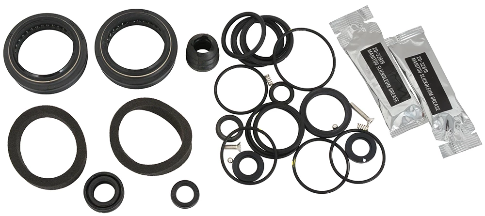 Le kit de service pour les fourches suspendues Manitou Mastodon, Mattoc et Magnum 34mm contient toutes les pièces de rechange nécessaires à un service complet.