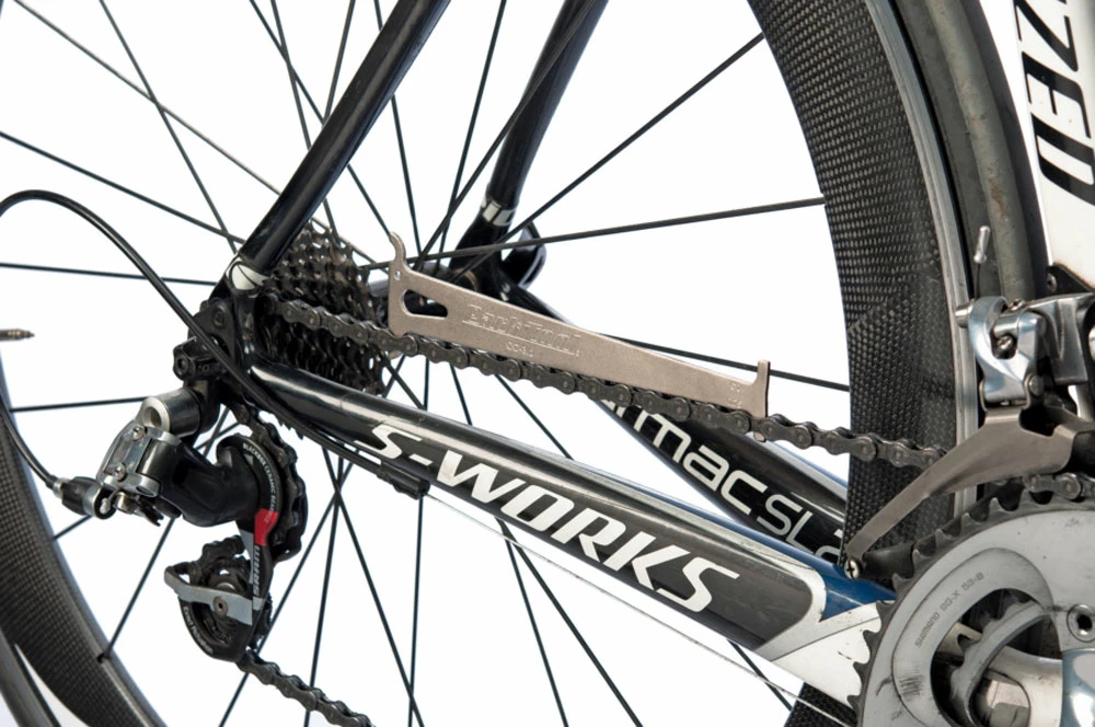 Une chaîne usée provoque un mauvais changement de vitesse et réduit considérablement la durée de vie des pignons. La jauge d’usure Park Tool CC-3.2 indique précisément si une chaîne est encore dans la tolérance d’allongement de 0,5 % (pour les chaînes à 9 et 10 vitesses) ou de 0,75 % (pour les chaînes à 11 et 12 vitesses) – les valeurs auxquelles la plupart des fabricants recommandent de changer la chaîne.