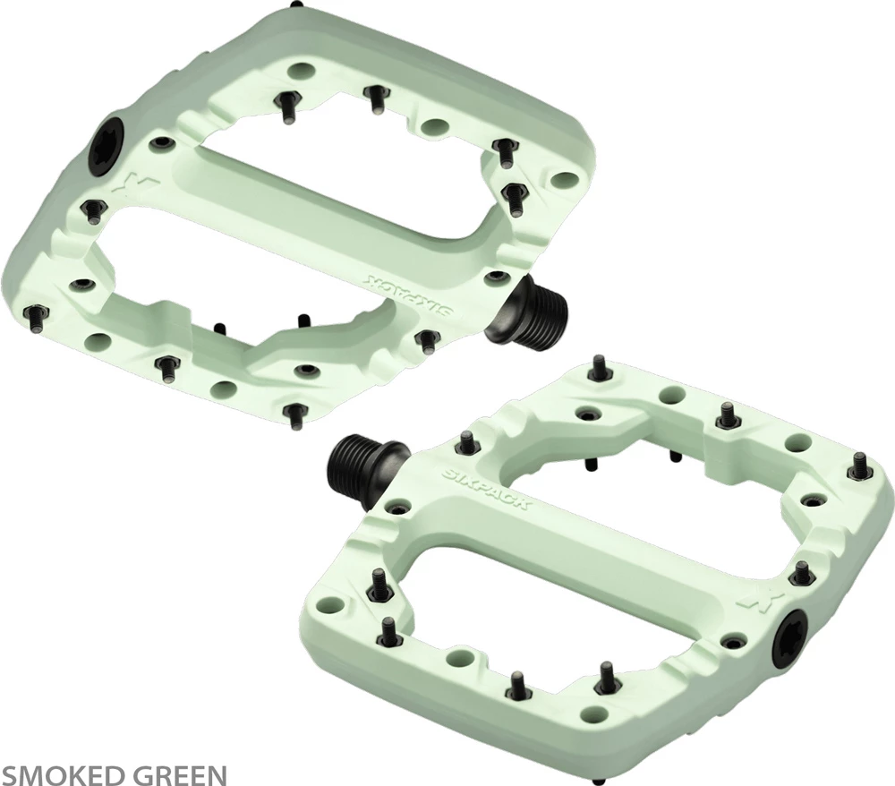 Les pédales Gravity “Kamikaze PA” de Sixpack Racing disposent d’une grande surface d’appui avec un profil préformé et 18 pins extra longs en acier. Le corps de pédale composite est fabriqué en polyamide renforcé de fibres de verre et résiste à des charges extrêmes.