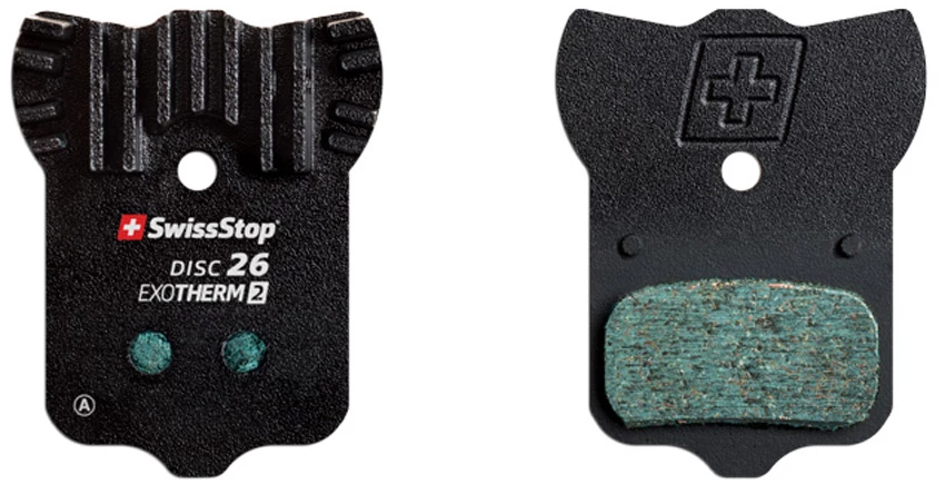 Le SwissStop 26 EXOTherm2 combine un mélange de gomme extrêmement durable et modulable de manière homogène avec une plaque arrière dotée d’ailettes de refroidissement qui permet un freinage stable et puissant dans toutes les conditions.