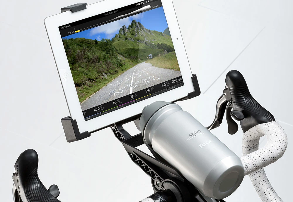 Le support pour guidon Tacx permet de fixer rapidement et facilement une tablette sur le guidon. Sa conception assure une distance suffisamment grande pour que l’écran ne transpire pas pendant l’entraînement.