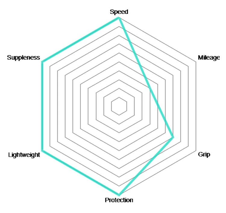 - La carcasse la plus légère et la bande de roulement la plus fine pour une vitesse maximale.