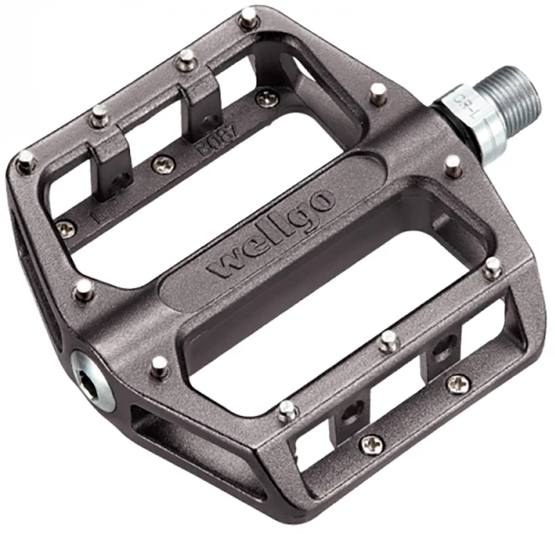 Les pédales de plateforme Wellgo B087B de haute qualité avec paliers lisses étanches pour les exigences les plus élevées sont forgées à partir d’une seule pièce d’aluminium et offrent une surface de contact extra large pour une prise en main sûre.